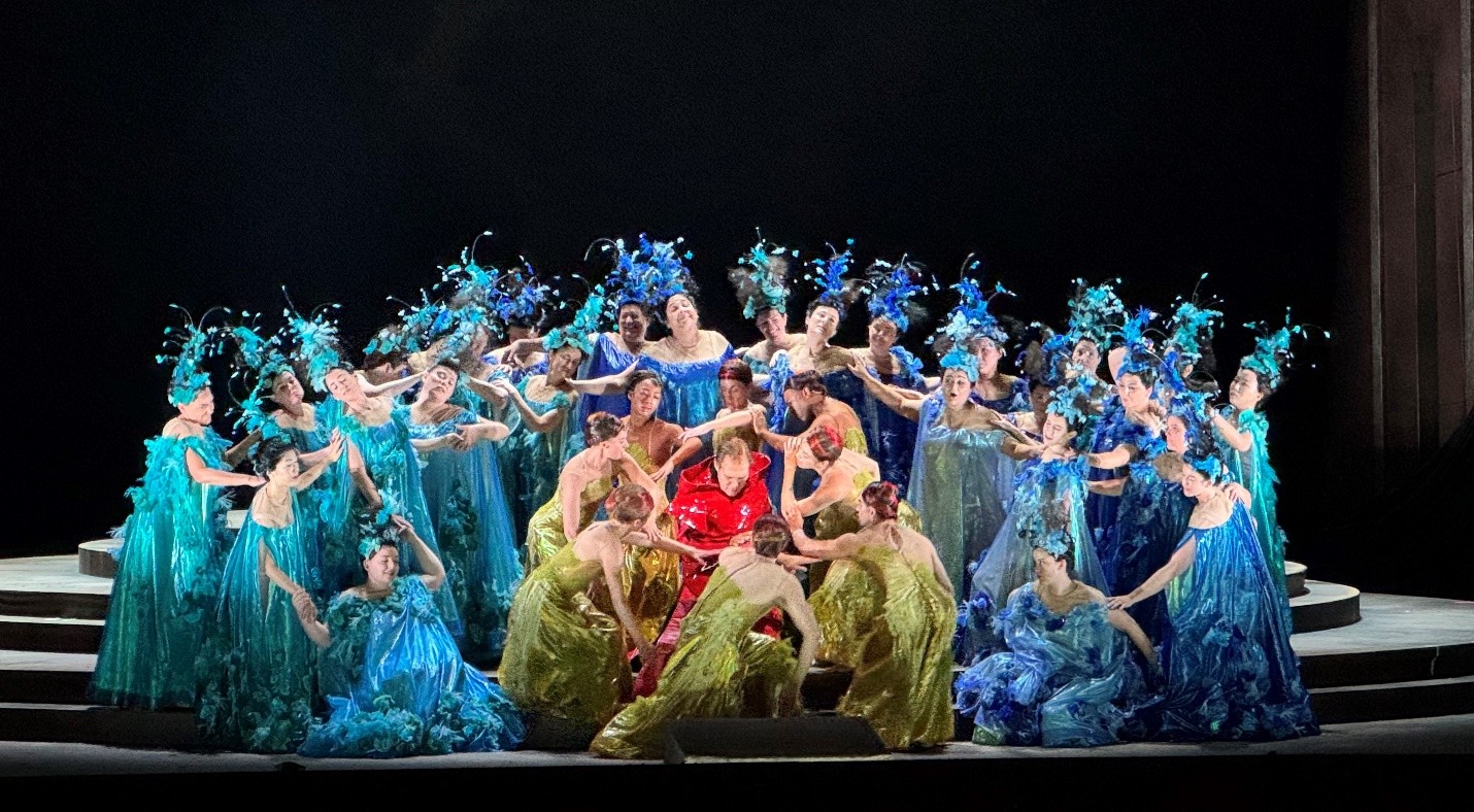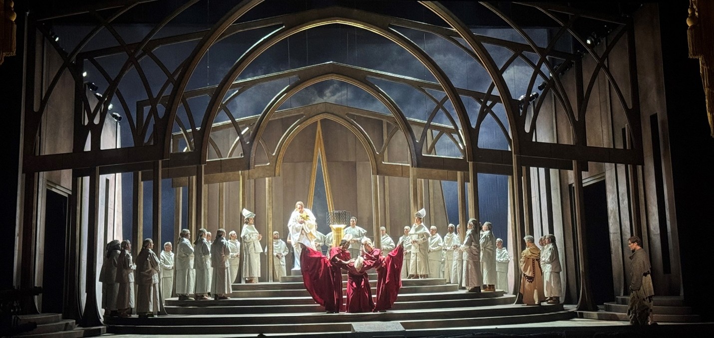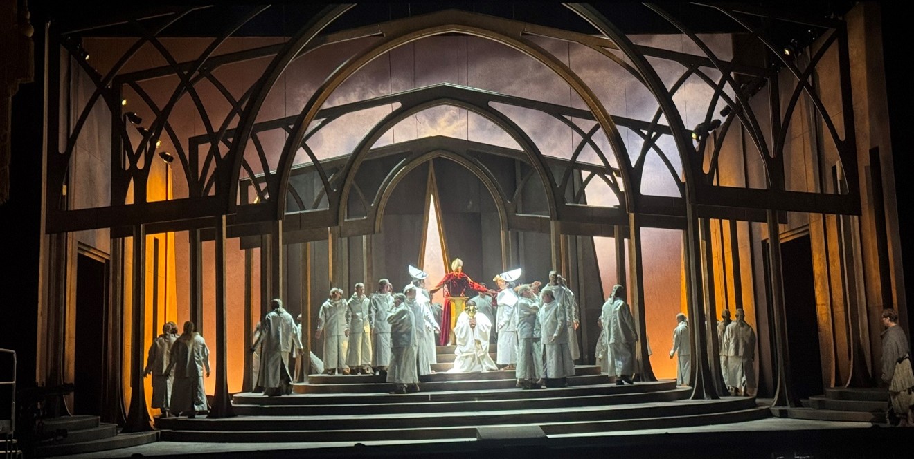 There was a moment in the piano dress rehearsal for Act I where we saw for the first time the intersection of Matthew Ozawa’s conception: Rena Butler’s movement, Jessica Jahn’s costumes, Robert Innes Hopkins’ set and Yuki Nakase Link’s lighting, and I suddenly felt that I, like the character of Parsifal, was there, watching the Knights of the Grail involved in the sacrificial rite of the Grail. The spaciousness of the music, the vestments of ritual, the kinetic energy of spirituality. I was invited in, and I was able to linger. It felt extraordinary.