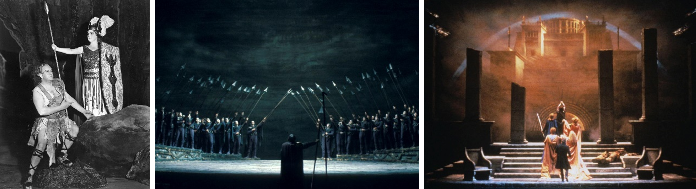Scenes from San Francisco Opera’s history with the Ring: Die Walküre (1935) with Lauritz Melchior and Kirsten Flagstad; Hunding summons the vassals in Götterdämmerung (1972); the gods enter Valhalla in Das Rheingold (1985).